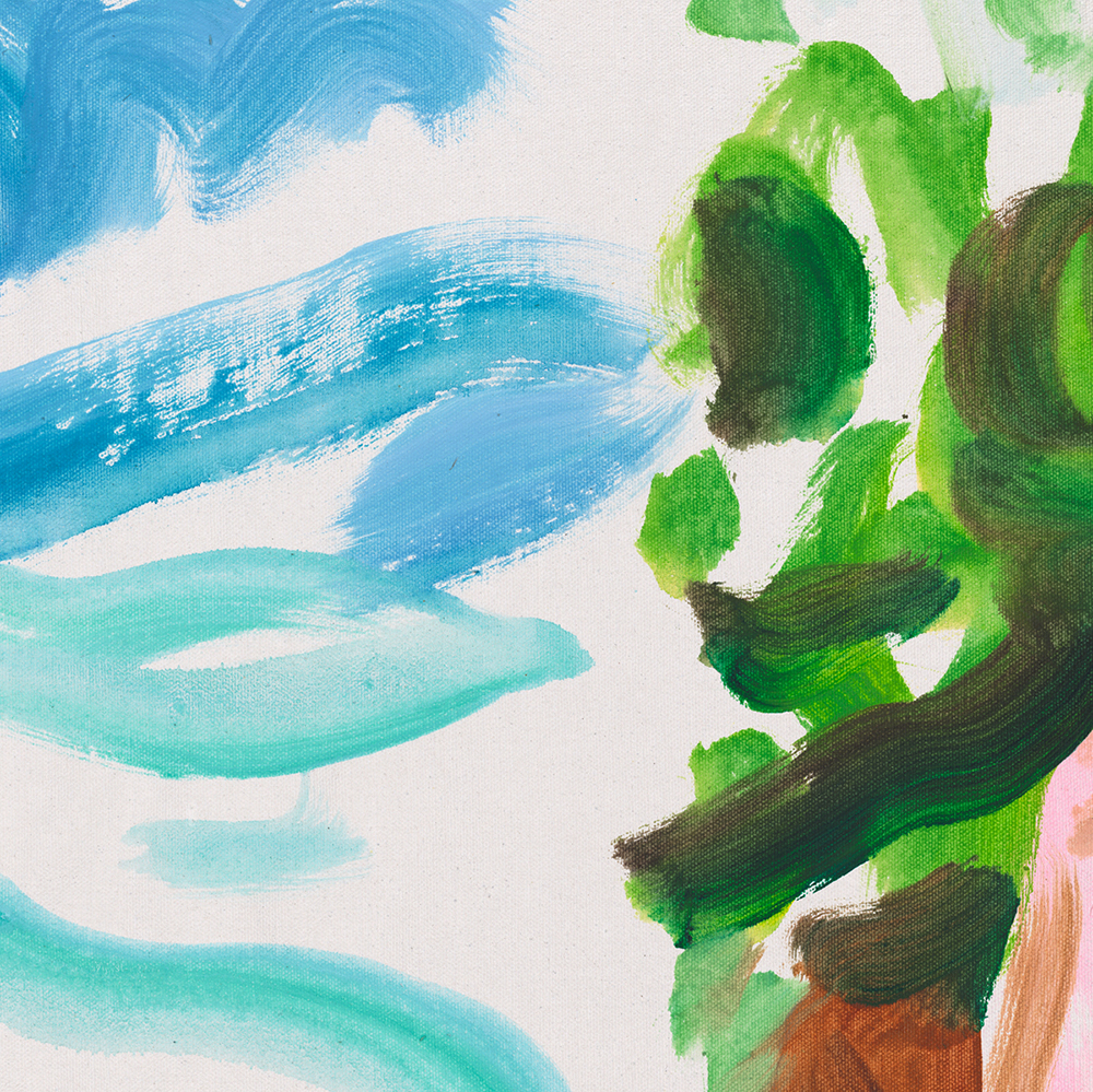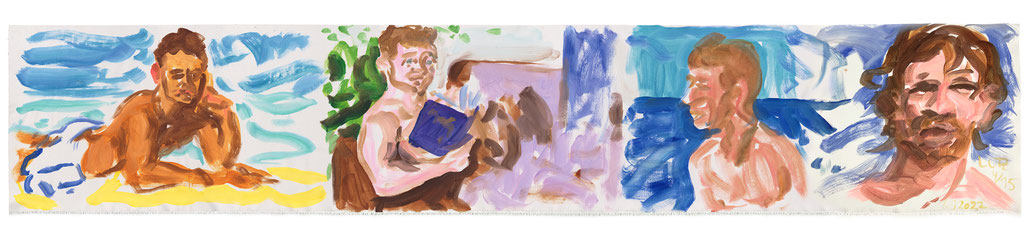 Strandung – After the group exhibition HAPPINESS IS A STATE OF MIND at the Kunsthalle Düsseldorf in early 2022, we got to know Dietmar Lutz. His works fascinated us immediately - they tell stories on countless meters of canvas. Each picture on the canvases stands on its own and yet there is a sequence that immerses the viewer in another world. And that's exactly what we wanted to realize in an edition. This is how the new unique edition "Strandung" by Dietmar Lutz was created. This wonderful edition was created by printing three of his motifs on a 305 x 54 cm canvas. Subsequently, another fourth hand-painted motif by Lutz was added, which varies with each work. A short story or "diary scroll" of the summer of 2022. Four motifs. One story. The edition of 15, each copy has a different final motif, the work is delivered rolled and can be placed freely. Published by VogelART 2022. Part of the proceeds will go to Münchner Aids-Hilfe e.V.