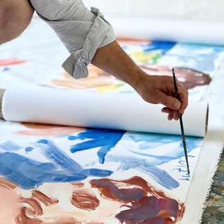 Dietmar Lutz (1968) is known for his large-format paintings – they are impressions of private spheres and at the same time reflect the question of how we see the world, how it is depicted and what role the artist and the viewer take. His style is reminiscent of the impressionists, but also of painting in the here and now. His motifs are figurative and abstract at the same time. At the same time they seem casual and sketchy. Highlights. But at the same time convey in a great way the captured momentum. He shows "modern life", tells stories in infinite meters of canvas – in the Kunsthalle Düsseldorf it was 25 by 1.67 meters. They give pleasure and make you dream. The works capture memories and they always show new facets of everyday life. Painting happens on the canvas strips lying on the floor - almost every day Dietmar Lutz paints a work, on the roll that seemingly never ends. During the pandemic, he painted a picture every day from August 2020 to August 2021 and published the 365 works in the book "One Year". Lutz lives and works in Düsseldorf.