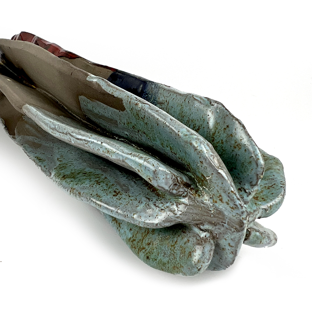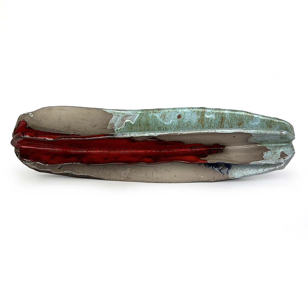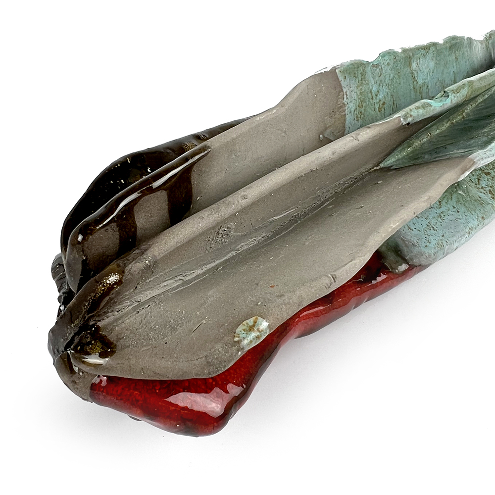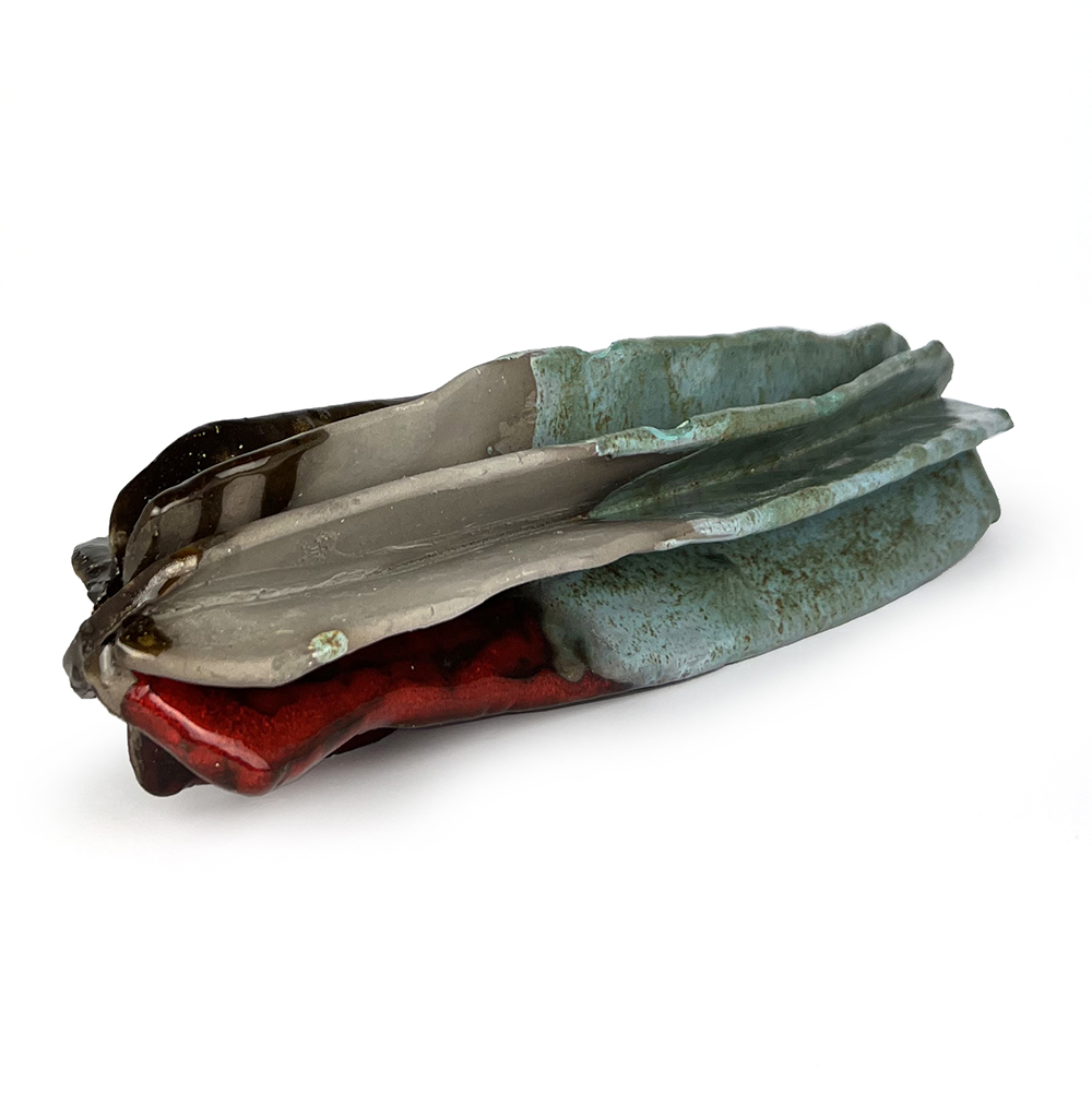 Les fleurs du sud – It was through a dear friend that we met the wonderful Isa Melsheimer and her solo show COMPOST (2021-2022) at the MAMAC Musée d'Art Moderne et d'Art Contemporain in Nice inspired us to create the edition "Les fleurs du sud". The edition – a series of ceramics – inspires the imagination with its language of color and form, and at the same time it seems naturally familiar. The organic shapes of concrete-gray clay are reminiscent of oversized seeds, cacti, or zeppelin-like flying bodies from another world. The strong, colorful glazes, which Melsheimer elaborately develops herself, alternate from bright red-orange to olive to aqua tones, creating a fascinating break with the learned natural form of the work for the viewer. The special feature of "Les fleurs du sud", the series of 15 individually handmade, differently glazed ceramics, is that the work can be turned over and over again, creating a new play of color, form, light and shadow. Published by VogelART in the fall of 2022.