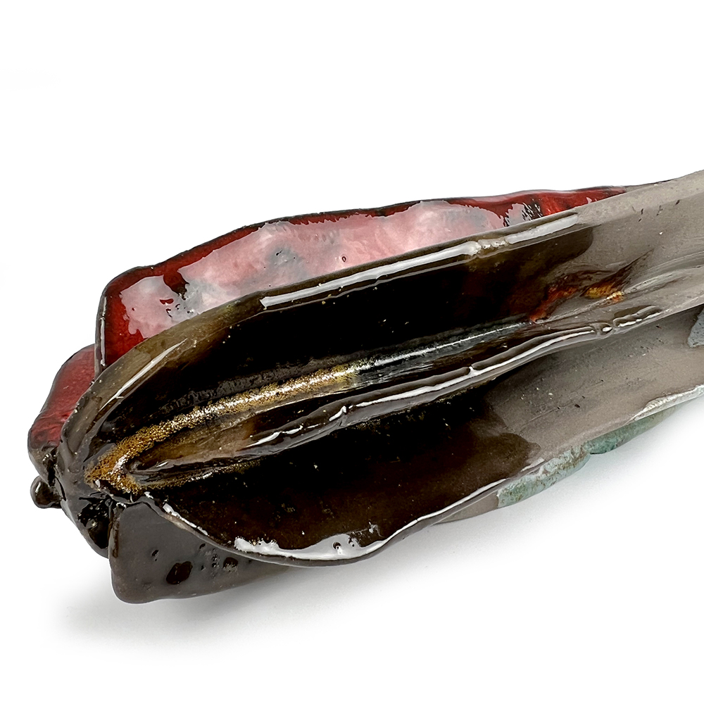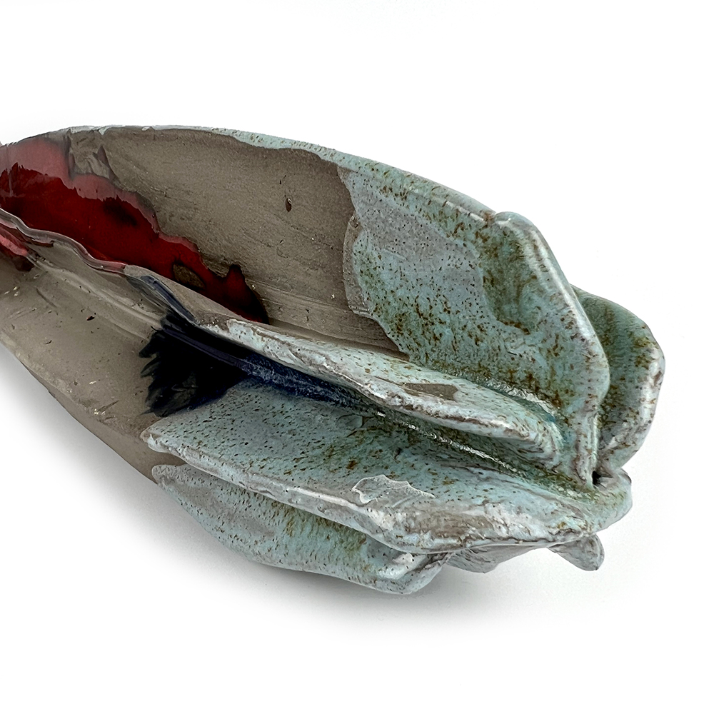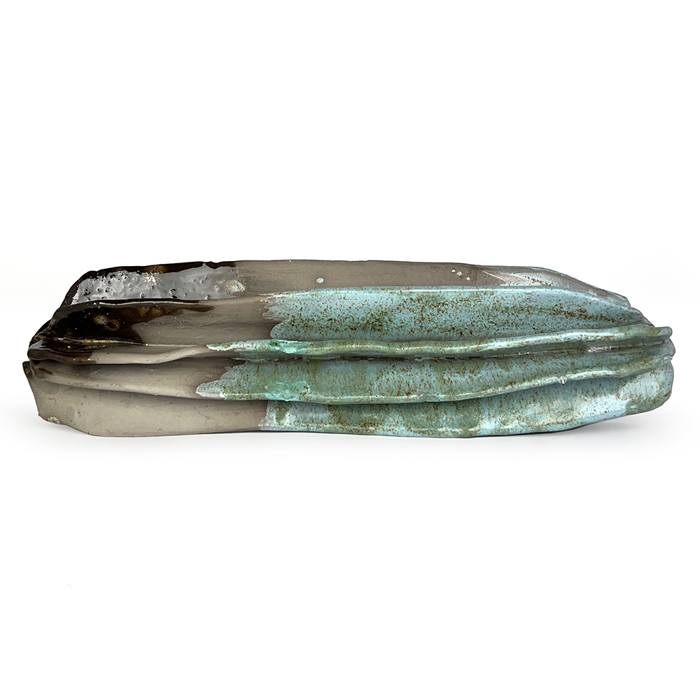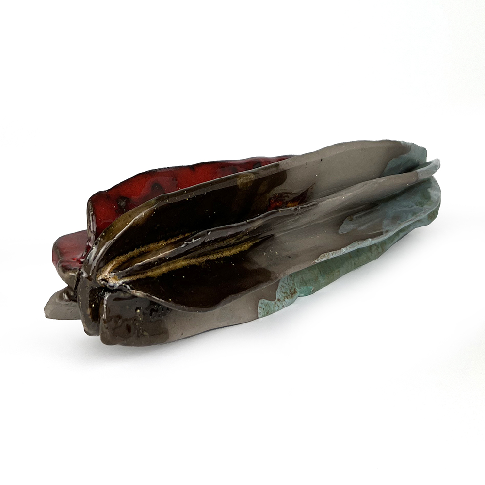 Les fleurs du sud – It was through a dear friend that we met the wonderful Isa Melsheimer and her solo show COMPOST (2021-2022) at the MAMAC Musée d'Art Moderne et d'Art Contemporain in Nice inspired us to create the edition "Les fleurs du sud". The edition – a series of ceramics – inspires the imagination with its language of color and form, and at the same time it seems naturally familiar. The organic shapes of concrete-gray clay are reminiscent of oversized seeds, cacti, or zeppelin-like flying bodies from another world. The strong, colorful glazes, which Melsheimer elaborately develops herself, alternate from bright red-orange to olive to aqua tones, creating a fascinating break with the learned natural form of the work for the viewer. The special feature of "Les fleurs du sud", the series of 15 individually handmade, differently glazed ceramics, is that the work can be turned over and over again, creating a new play of color, form, light and shadow. Published by VogelART in the fall of 2022.