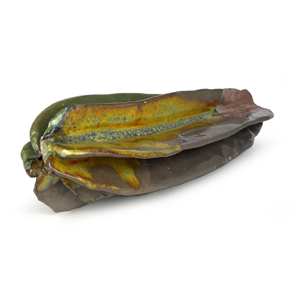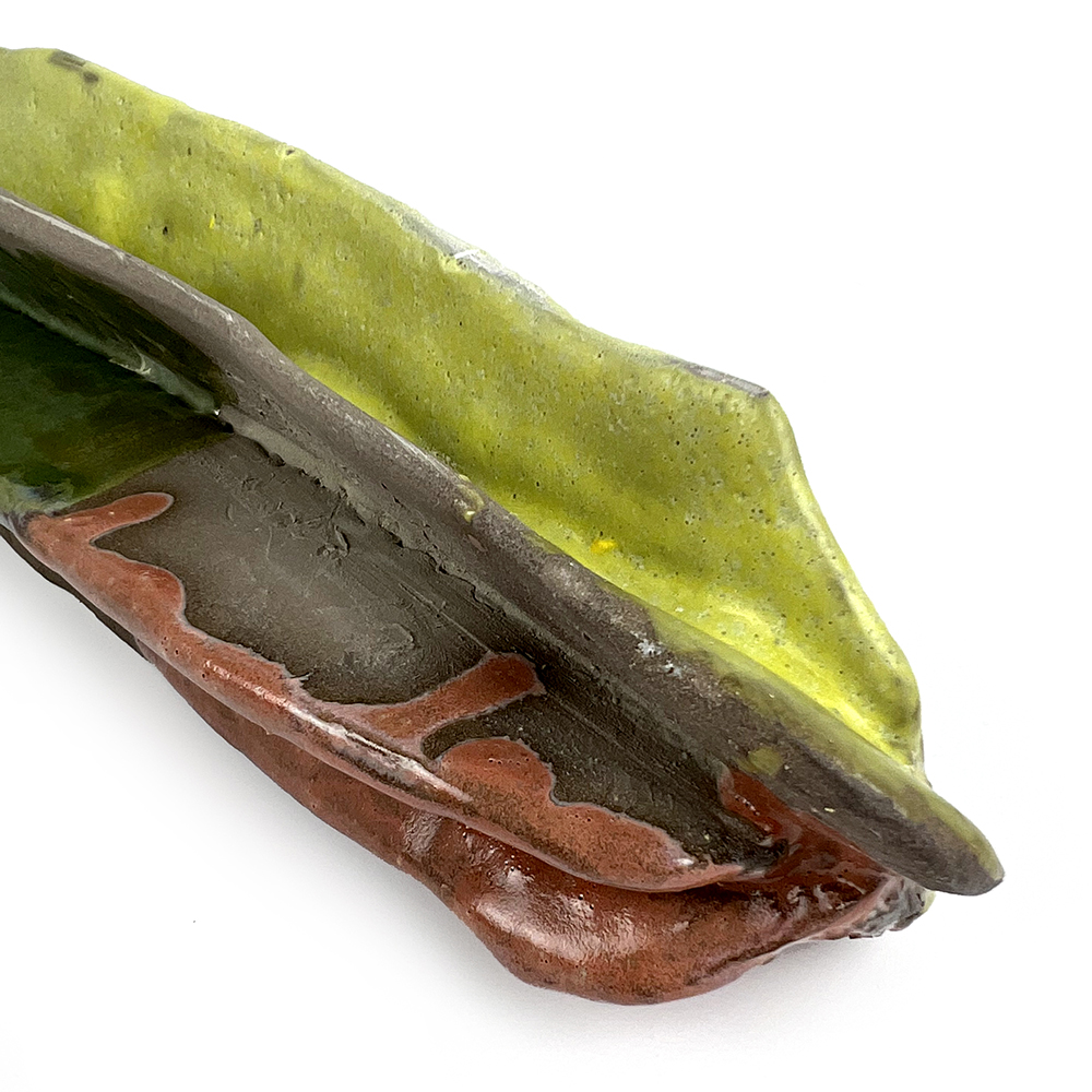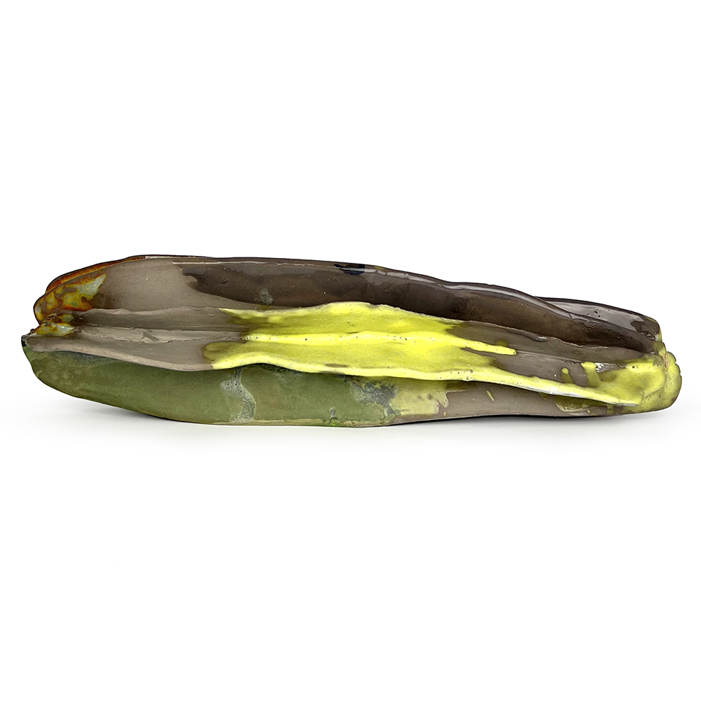 Les fleurs du sud – It was through a dear friend that we met the wonderful Isa Melsheimer and her solo show COMPOST (2021-2022) at the MAMAC Musée d'Art Moderne et d'Art Contemporain in Nice inspired us to create the edition "Les fleurs du sud". The edition – a series of ceramics – inspires the imagination with its language of color and form, and at the same time it seems naturally familiar. The organic shapes of concrete-gray clay are reminiscent of oversized seeds, cacti, or zeppelin-like flying bodies from another world. The strong, colorful glazes, which Melsheimer elaborately develops herself, alternate from bright red-orange to olive to aqua tones, creating a fascinating break with the learned natural form of the work for the viewer. The special feature of "Les fleurs du sud", the series of 15 individually handmade, differently glazed ceramics, is that the work can be turned over and over again, creating a new play of color, form, light and shadow. Published by VogelART in the fall of 2022.