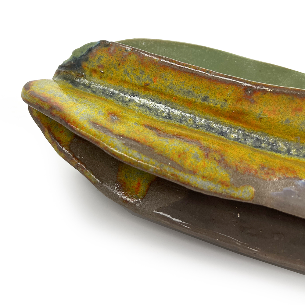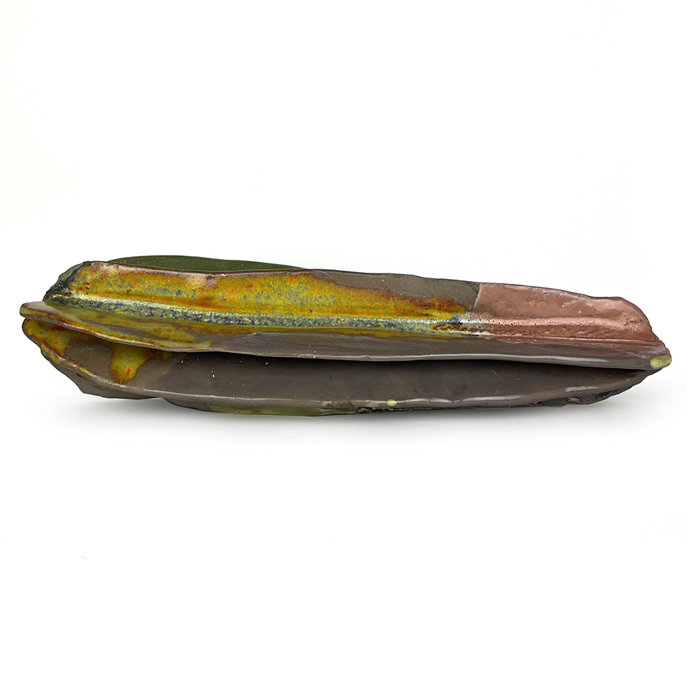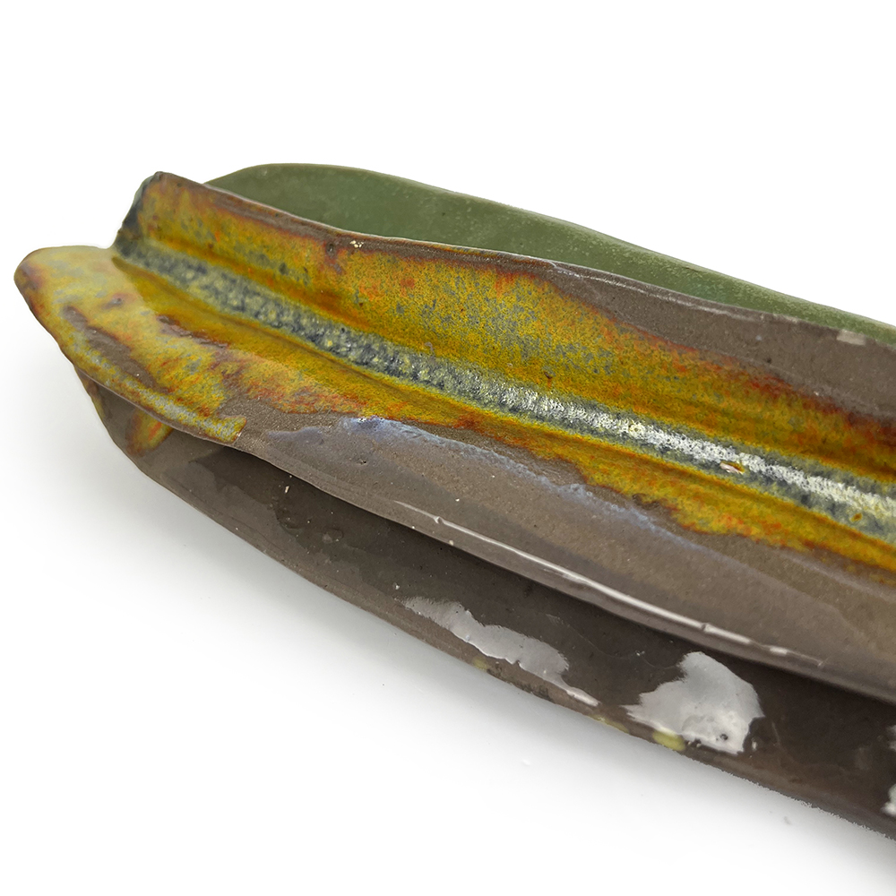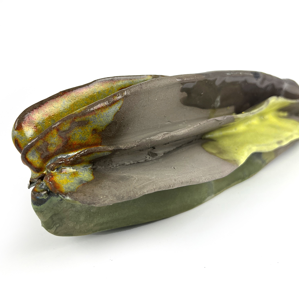 Les fleurs du sud – It was through a dear friend that we met the wonderful Isa Melsheimer and her solo show COMPOST (2021-2022) at the MAMAC Musée d'Art Moderne et d'Art Contemporain in Nice inspired us to create the edition "Les fleurs du sud". The edition – a series of ceramics – inspires the imagination with its language of color and form, and at the same time it seems naturally familiar. The organic shapes of concrete-gray clay are reminiscent of oversized seeds, cacti, or zeppelin-like flying bodies from another world. The strong, colorful glazes, which Melsheimer elaborately develops herself, alternate from bright red-orange to olive to aqua tones, creating a fascinating break with the learned natural form of the work for the viewer. The special feature of "Les fleurs du sud", the series of 15 individually handmade, differently glazed ceramics, is that the work can be turned over and over again, creating a new play of color, form, light and shadow. Published by VogelART in the fall of 2022.