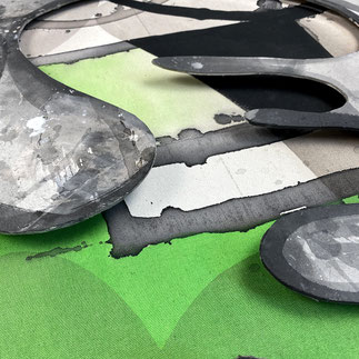 In his work, Jan-Ole Schiemann refers to the traditions of painting and questions them through collage-based techniques by constructing pictures that are both challenging and playful. Almost