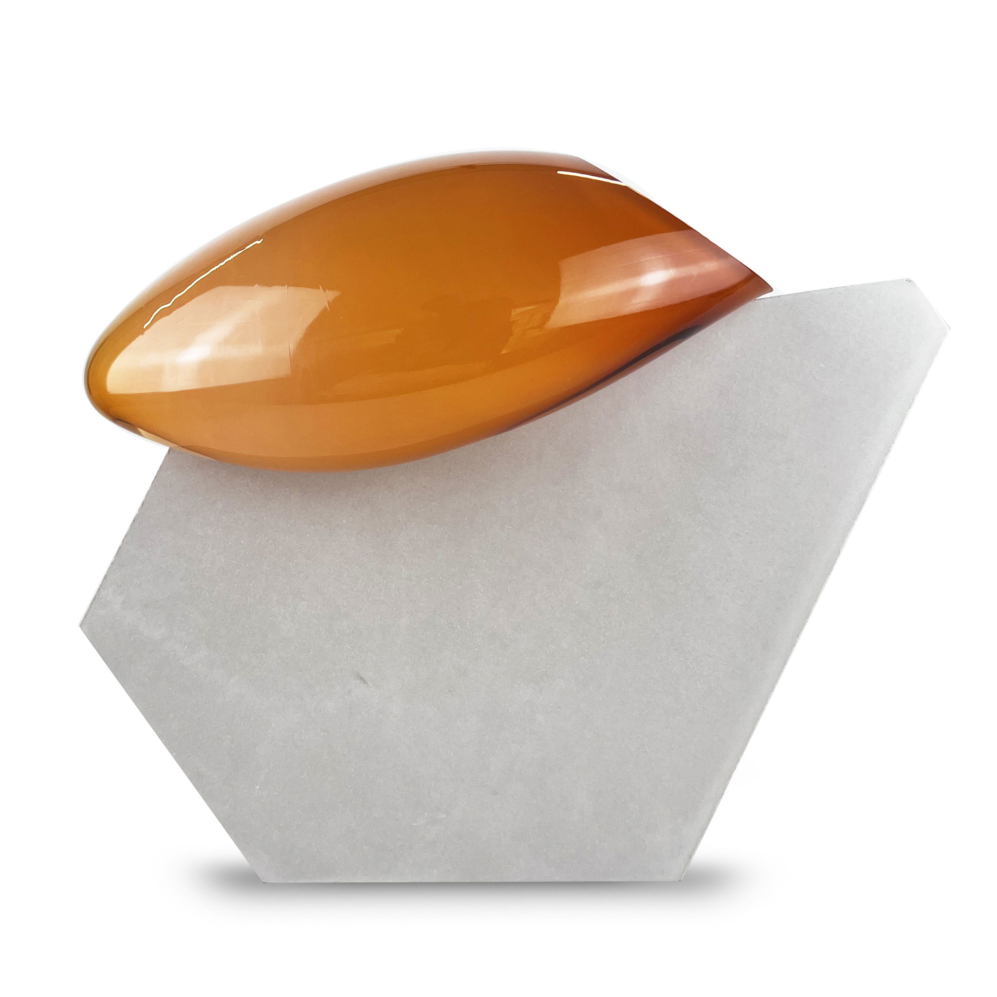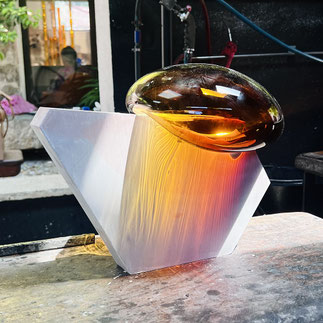 Inspiriert durch ihre raumgreifenden Installationen Bubbles (2012) und Dust Devil (2015) entstand die Serie Bubble. Eine zweiteilige Skulptur aus Beton und mundgeblasenen Glas. Im Juni 2025 waren Morgane Tschiember und wir einige Tage in Biot, der traditionsreichen Glasbläserstadt in Südfrankreich, wo eine Serie von 15 skulpturalen Arbeiten entstand. Die jeweils mundgeblasene Glasform, in unterschiedlichen Farben,  mit einer Betonform verbindet. Jede Glaskomponente ist ein Unikat: Form, Farbe und Lichtbrechung variieren – keine Arbeit gleicht der anderen. Fragilität trifft auf Masse, Schweben auf Stabilität – eine fragile Balance, die Morganes Werk eindrucksvoll verkörpert. Die glatte, leichte, fließende Glasform ist der Kontrast zu dem rauen Beton. Das Format ist der Skulptur variiert durch die Glasform, es ist ca. 35 x 40 x 25 cm. Signiert und nummeriert von Morgane Tschiember mit einem Fingerabdruck.