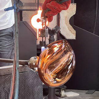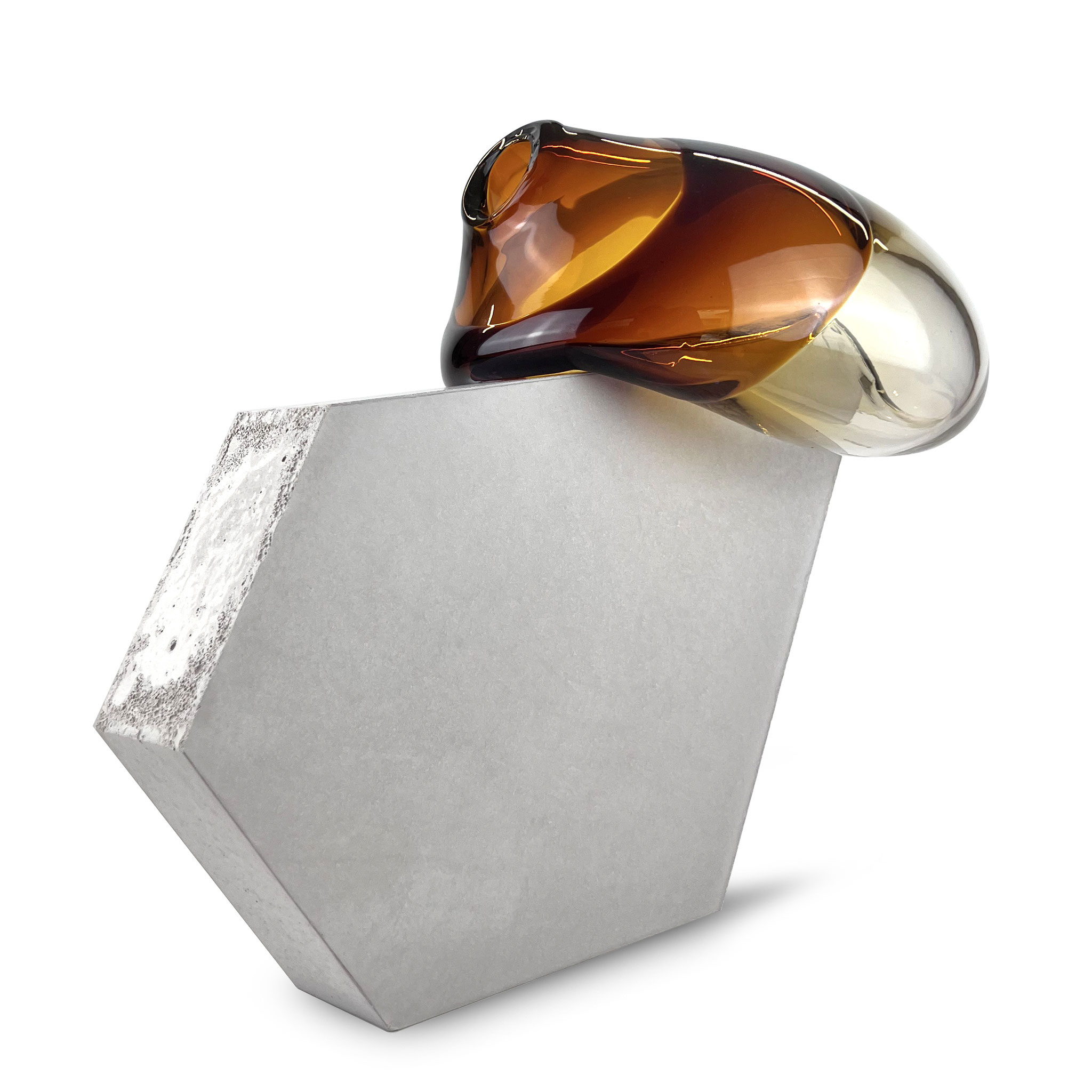 Inspiriert durch ihre raumgreifenden Installationen Bubbles (2012) und Dust Devil (2015) entstand die Serie Bubble. Eine zweiteilige Skulptur aus Beton und mundgeblasenen Glas. Im Juni 2025 waren Morgane Tschiember und wir einige Tage in Biot, der traditionsreichen Glasbläserstadt in Südfrankreich, wo eine Serie von 15 skulpturalen Arbeiten entstand. Die jeweils mundgeblasene Glasform, in unterschiedlichen Farben,  mit einer Betonform verbindet. Jede Glaskomponente ist ein Unikat: Form, Farbe und Lichtbrechung variieren – keine Arbeit gleicht der anderen. Fragilität trifft auf Masse, Schweben auf Stabilität – eine fragile Balance, die Morganes Werk eindrucksvoll verkörpert. Die glatte, leichte, fließende Glasform ist der Kontrast zu dem rauen Beton. Das Format ist der Skulptur variiert durch die Glasform, es ist ca. 35 x 40 x 25 cm. Signiert und nummeriert von Morgane Tschiember mit einem Fingerabdruck.