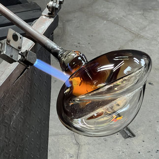 Inspiriert durch ihre raumgreifenden Installationen Bubbles (2012) und Dust Devil (2015) entstand die Serie Bubble. Eine zweiteilige Skulptur aus Beton und mundgeblasenen Glas. Im Juni 2025 waren Morgane Tschiember und wir einige Tage in Biot, der traditionsreichen Glasbläserstadt in Südfrankreich, wo eine Serie von 15 skulpturalen Arbeiten entstand. Die jeweils mundgeblasene Glasform, in unterschiedlichen Farben,  mit einer Betonform verbindet. Jede Glaskomponente ist ein Unikat: Form, Farbe und Lichtbrechung variieren – keine Arbeit gleicht der anderen. Fragilität trifft auf Masse, Schweben auf Stabilität – eine fragile Balance, die Morganes Werk eindrucksvoll verkörpert. Die glatte, leichte, fließende Glasform ist der Kontrast zu dem rauen Beton. Das Format ist der Skulptur variiert durch die Glasform, es ist ca. 35 x 40 x 25 cm. Signiert und nummeriert von Morgane Tschiember mit einem Fingerabdruck.