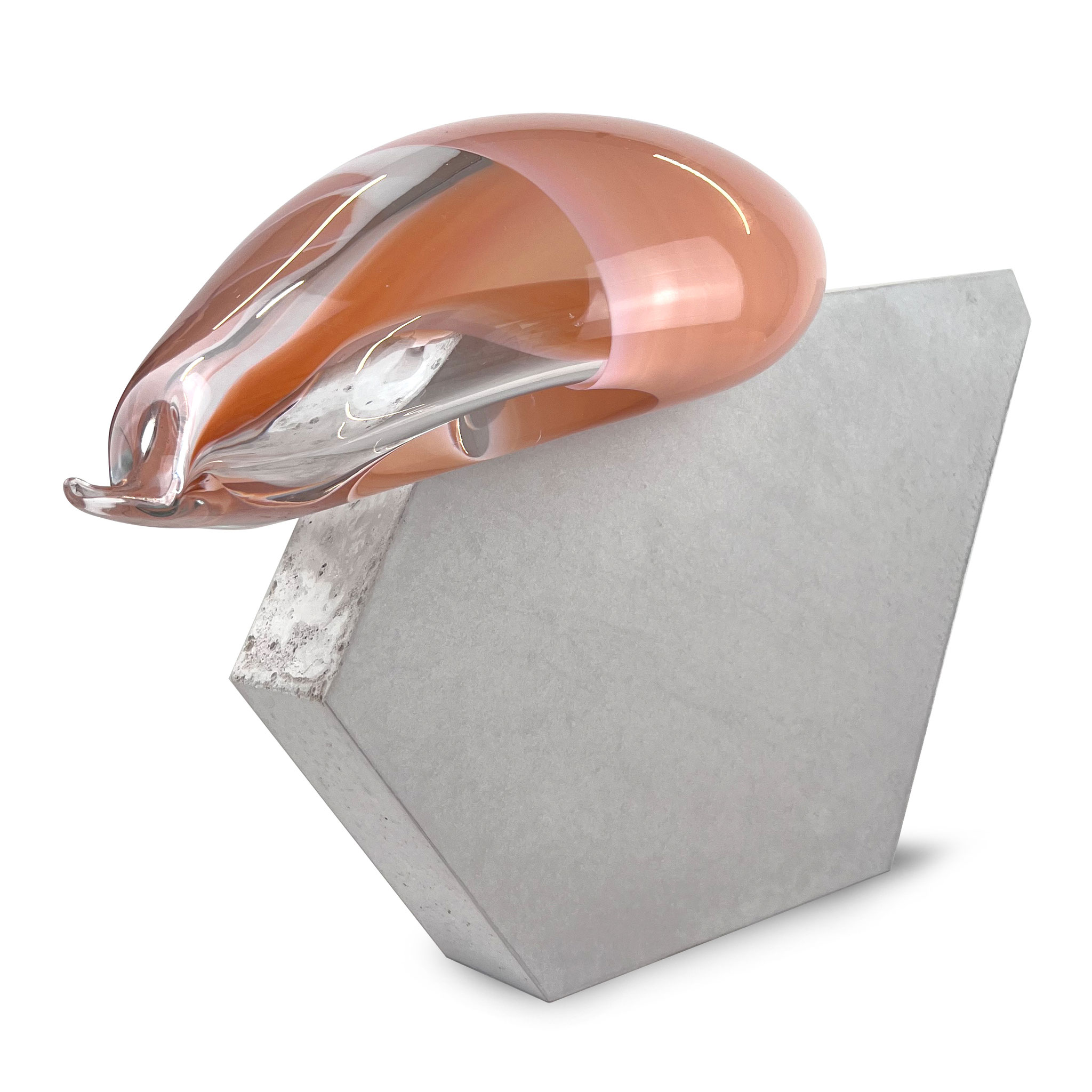 Inspired by her expansive installations Bubbles (2012) and Dust Devil (2015), the series Bubble was created. A two-part sculpture made of concrete and mouth-blown glass. In June 2025, Morgane Tschiember and we spent a few days in Biot, the traditional glassblowing town in southern France, where a series of 15 sculptural works was created. Each mouth-blown glass form, in different colors, is combined with a concrete form. Each glass component is unique: shape, color, and refraction vary – no two works are alike. Fragility meets mass, floating meets stability – a fragile balance that Morgane's work impressively embodies. The smooth, light, flowing glass form contrasts with the rough concrete. The format of the sculpture varies depending on the glass form; it measures approximately 35 x 40 x 25 cm. Signed and numbered by the artist with a finger print.