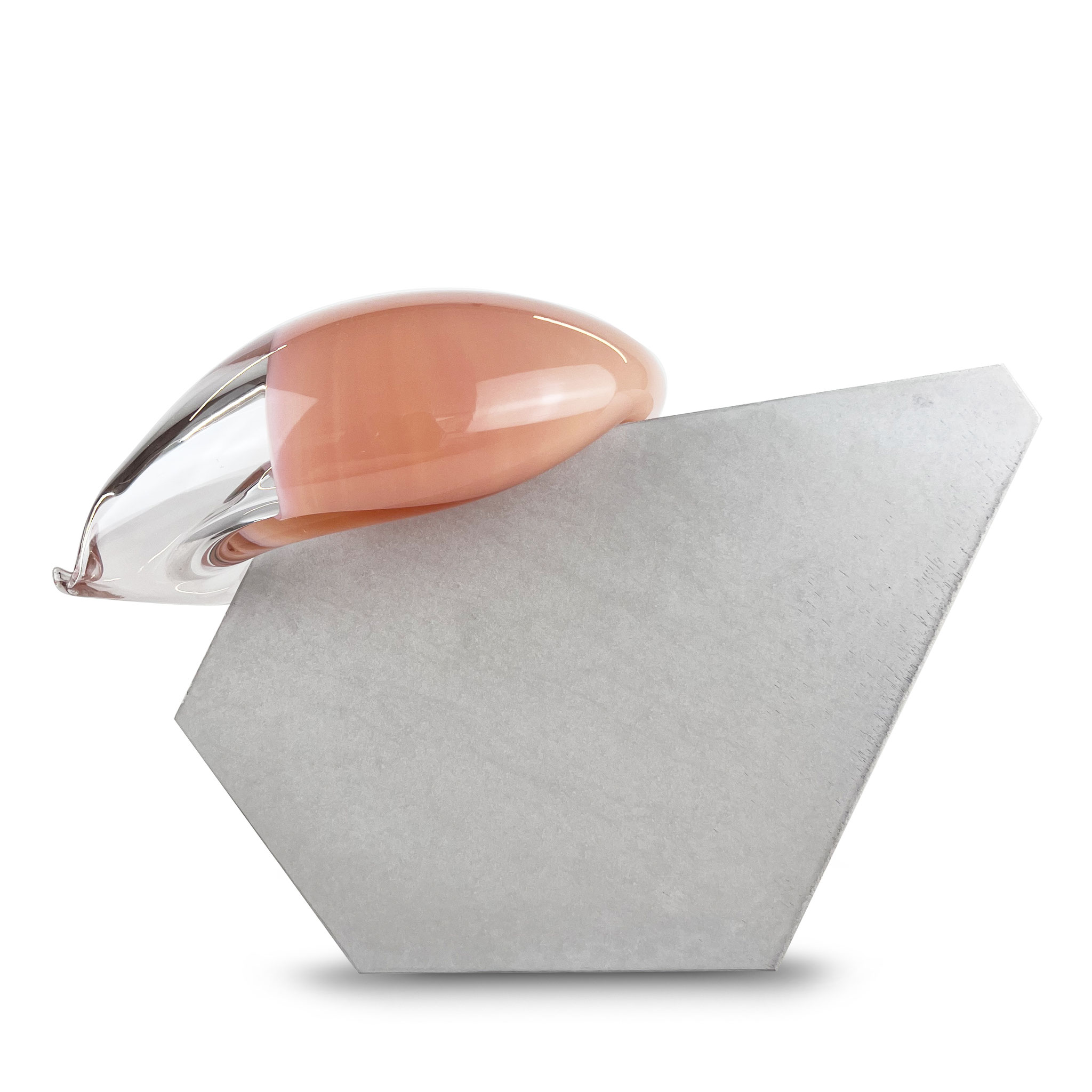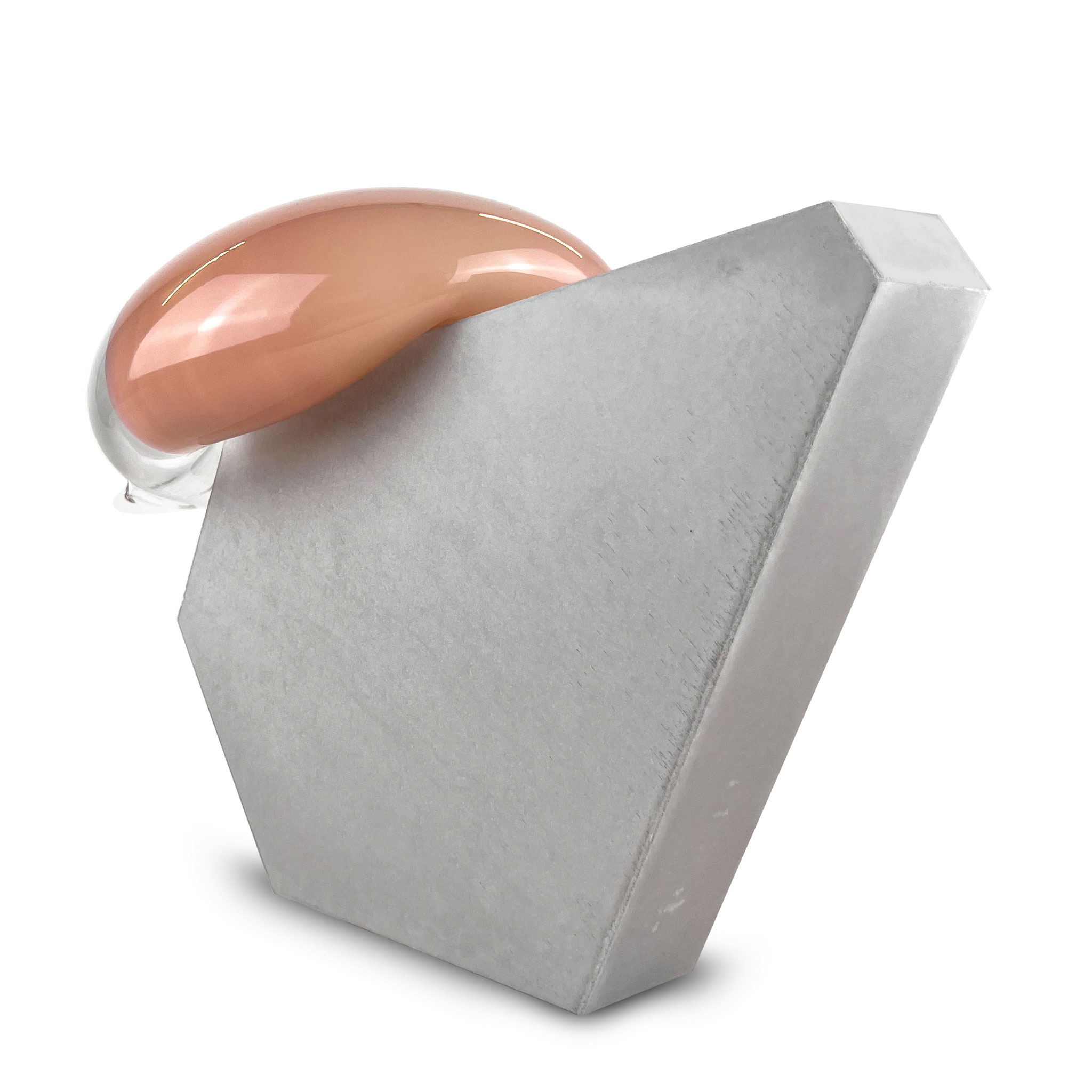 Inspiriert durch ihre raumgreifenden Installationen Bubbles (2012) und Dust Devil (2015) entstand die Serie Bubble. Eine zweiteilige Skulptur aus Beton und mundgeblasenen Glas. Im Juni 2025 waren Morgane Tschiember und wir einige Tage in Biot, der traditionsreichen Glasbläserstadt in Südfrankreich, wo eine Serie von 15 skulpturalen Arbeiten entstand. Die jeweils mundgeblasene Glasform, in unterschiedlichen Farben,  mit einer Betonform verbindet. Jede Glaskomponente ist ein Unikat: Form, Farbe und Lichtbrechung variieren – keine Arbeit gleicht der anderen. Fragilität trifft auf Masse, Schweben auf Stabilität – eine fragile Balance, die Morganes Werk eindrucksvoll verkörpert. Die glatte, leichte, fließende Glasform ist der Kontrast zu dem rauen Beton. Das Format ist der Skulptur variiert durch die Glasform, es ist ca. 35 x 40 x 25 cm. Signiert und nummeriert von Morgane Tschiember mit einem Fingerabdruck.