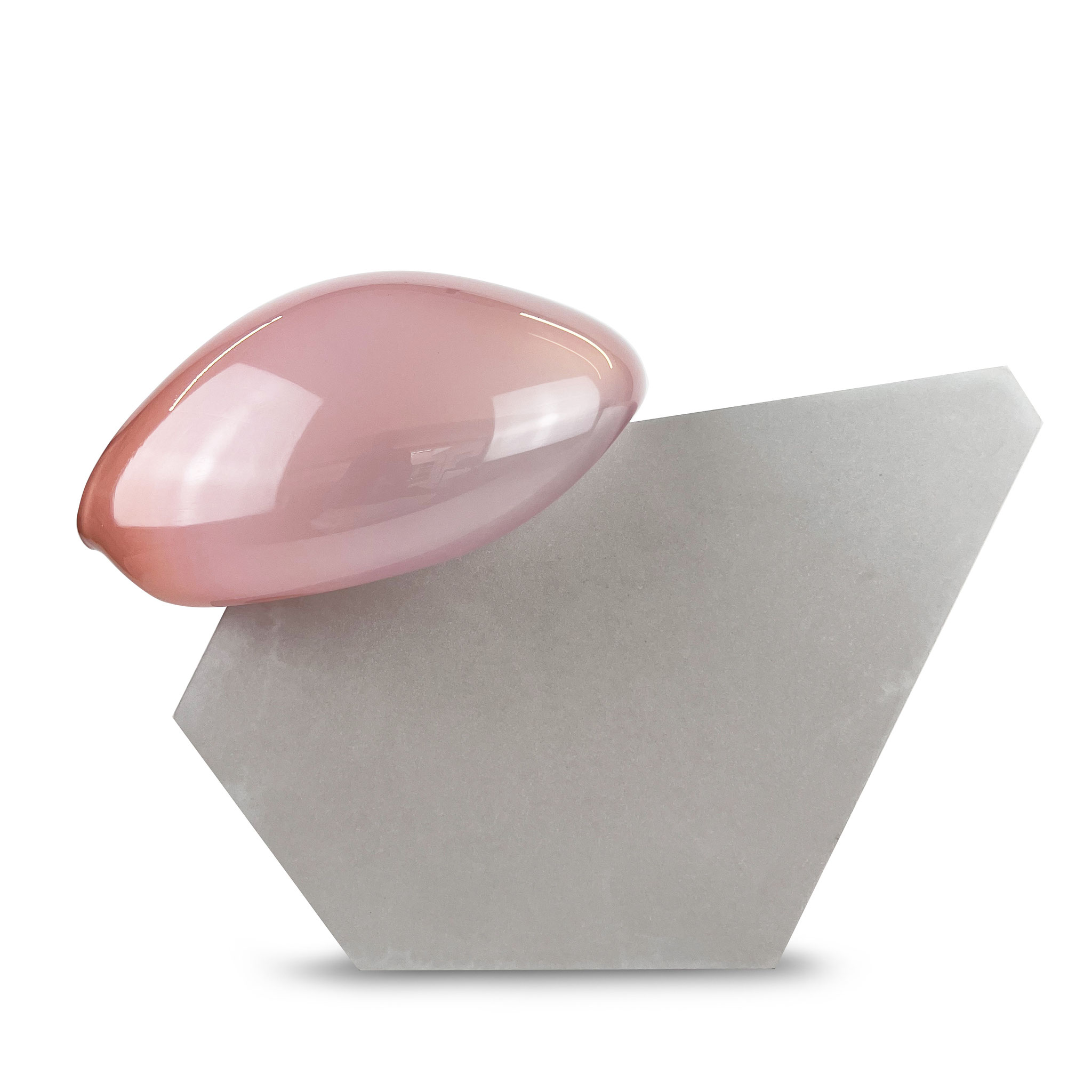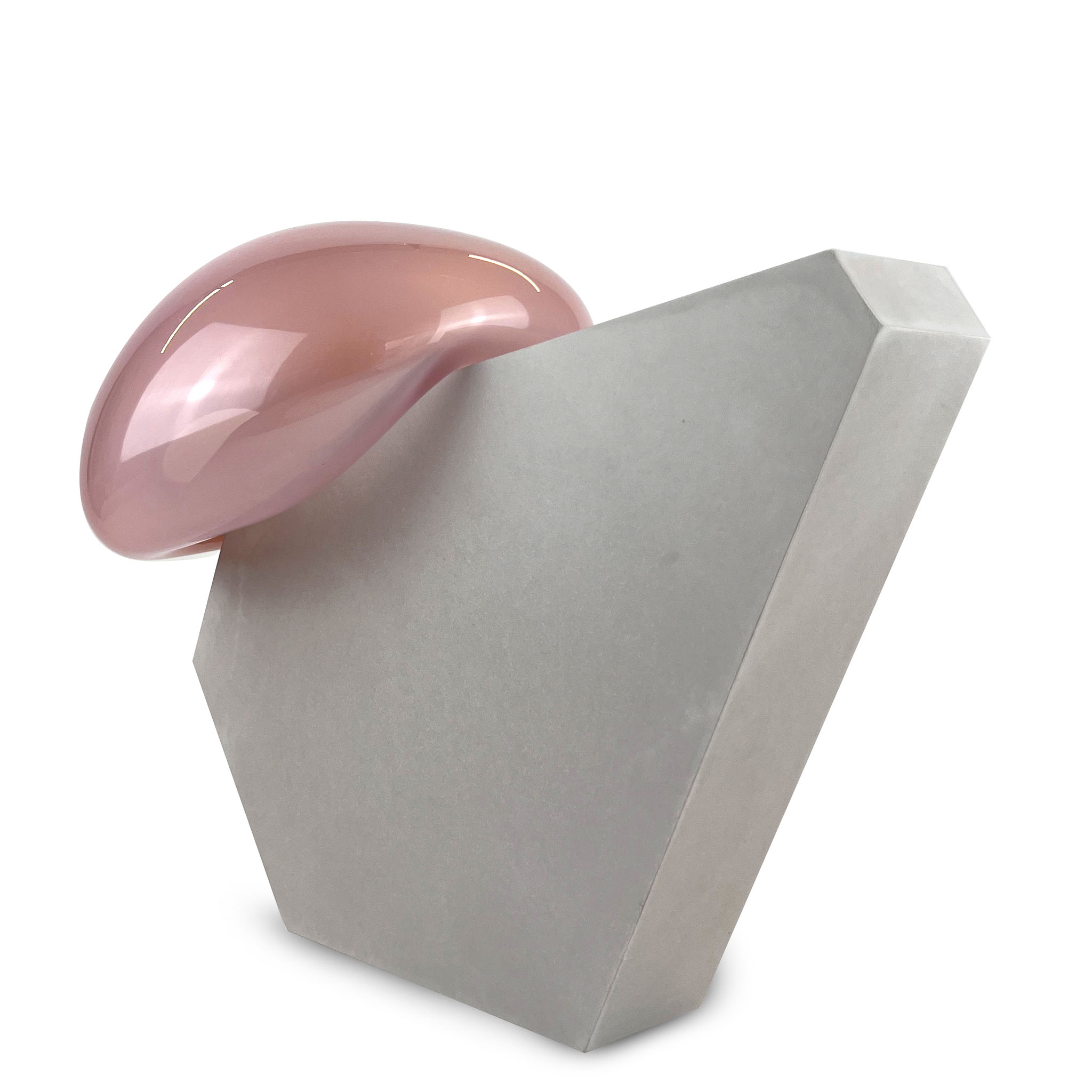 Inspiriert durch ihre raumgreifenden Installationen Bubbles (2012) und Dust Devil (2015) entstand die Serie Bubble. Eine zweiteilige Skulptur aus Beton und mundgeblasenen Glas. Im Juni 2025 waren Morgane Tschiember und wir einige Tage in Biot, der traditionsreichen Glasbläserstadt in Südfrankreich, wo eine Serie von 15 skulpturalen Arbeiten entstand. Die jeweils mundgeblasene Glasform, in unterschiedlichen Farben,  mit einer Betonform verbindet. Jede Glaskomponente ist ein Unikat: Form, Farbe und Lichtbrechung variieren – keine Arbeit gleicht der anderen. Fragilität trifft auf Masse, Schweben auf Stabilität – eine fragile Balance, die Morganes Werk eindrucksvoll verkörpert. Die glatte, leichte, fließende Glasform ist der Kontrast zu dem rauen Beton. Das Format ist der Skulptur variiert durch die Glasform, es ist ca. 35 x 40 x 25 cm. Signiert und nummeriert von Morgane Tschiember mit einem Fingerabdruck.