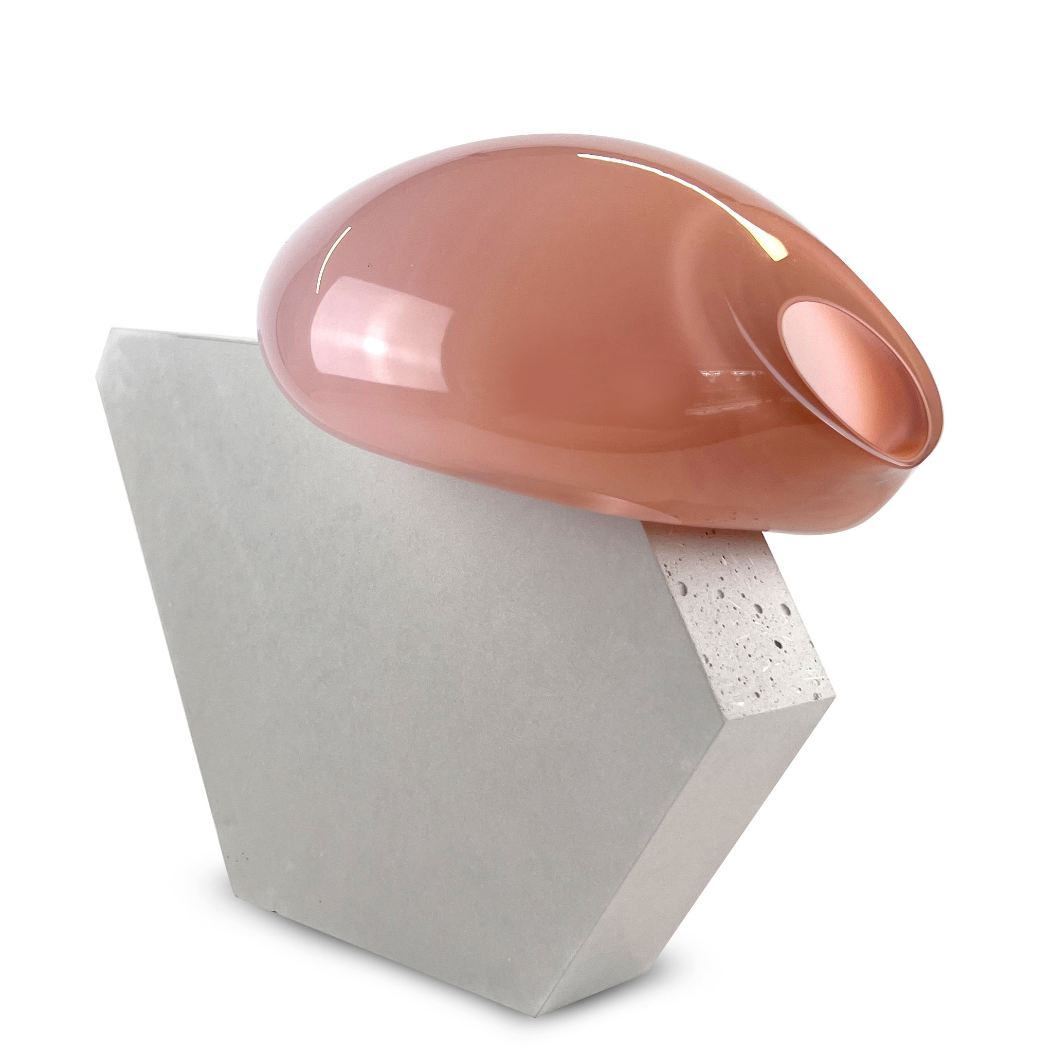 Inspired by her expansive installations Bubbles (2012) and Dust Devil (2015), the series Bubble was created. A two-part sculpture made of concrete and mouth-blown glass. In June 2025, Morgane Tschiember and we spent a few days in Biot, the traditional glassblowing town in southern France, where a series of 15 sculptural works was created. Each mouth-blown glass form, in different colors, is combined with a concrete form. Each glass component is unique: shape, color, and refraction vary – no two works are alike. Fragility meets mass, floating meets stability – a fragile balance that Morgane's work impressively embodies. The smooth, light, flowing glass form contrasts with the rough concrete. The format of the sculpture varies depending on the glass form; it measures approximately 35 x 40 x 25 cm. Signed and numbered by the artist with a finger print.