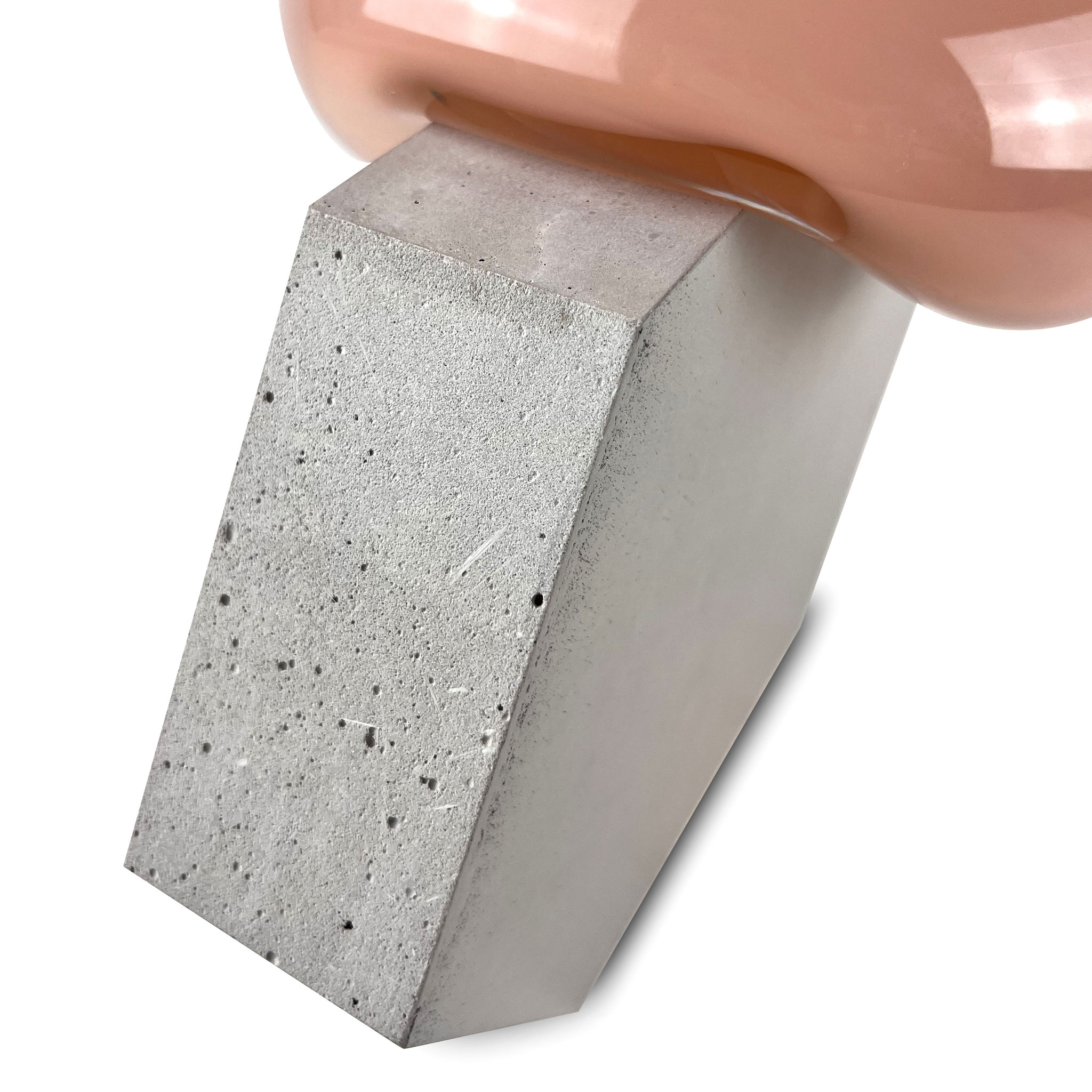 Inspired by her expansive installations Bubbles (2012) and Dust Devil (2015), the series Bubble was created. A two-part sculpture made of concrete and mouth-blown glass. In June 2025, Morgane Tschiember and we spent a few days in Biot, the traditional glassblowing town in southern France, where a series of 15 sculptural works was created. Each mouth-blown glass form, in different colors, is combined with a concrete form. Each glass component is unique: shape, color, and refraction vary – no two works are alike. Fragility meets mass, floating meets stability – a fragile balance that Morgane's work impressively embodies. The smooth, light, flowing glass form contrasts with the rough concrete. The format of the sculpture varies depending on the glass form; it measures approximately 35 x 40 x 25 cm. Signed and numbered by the artist with a finger print.