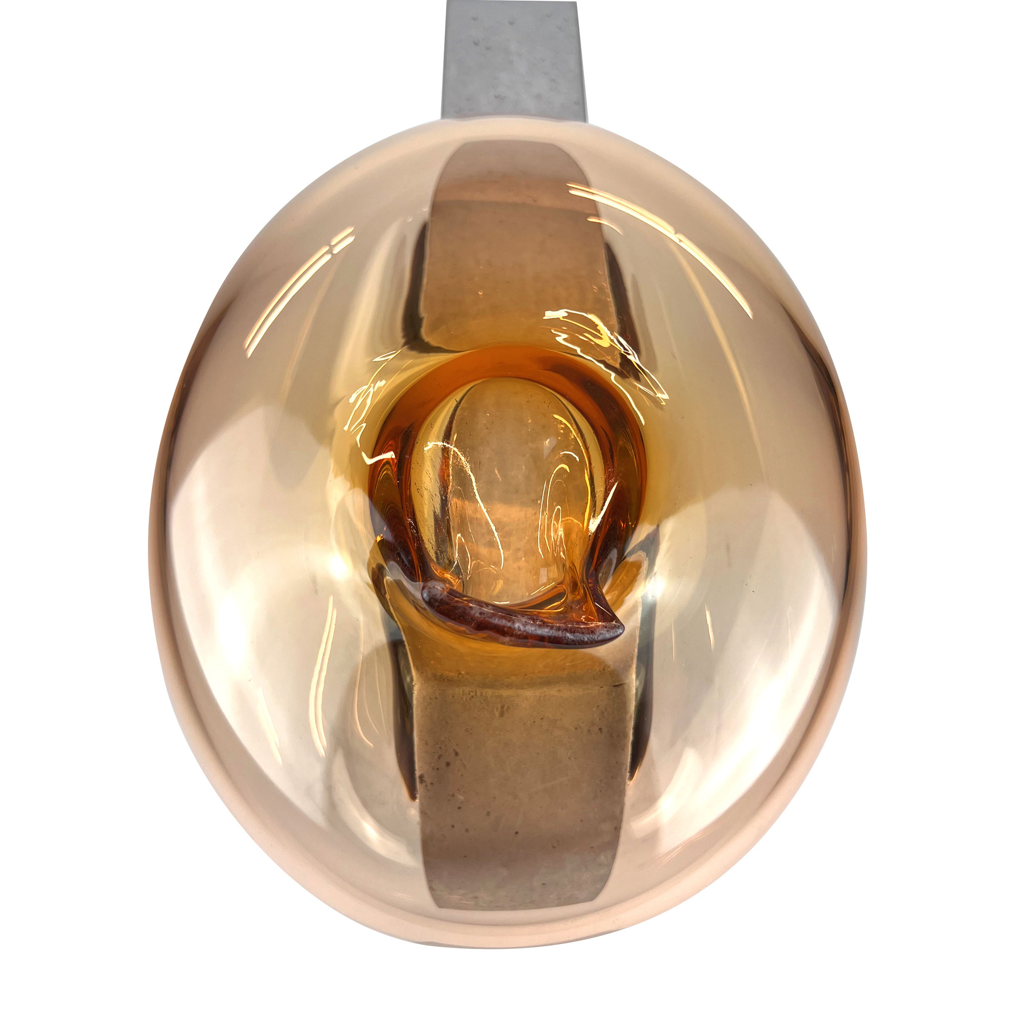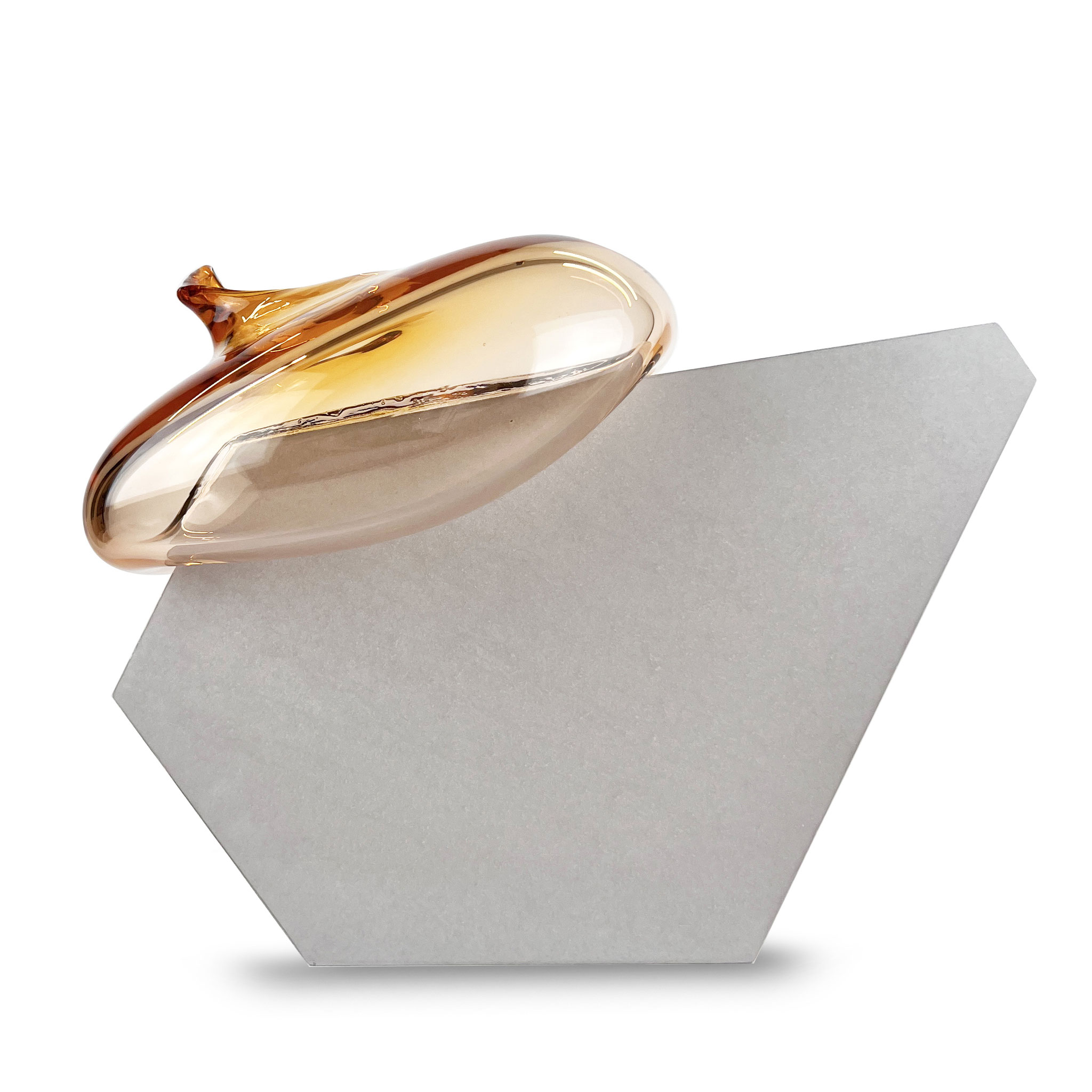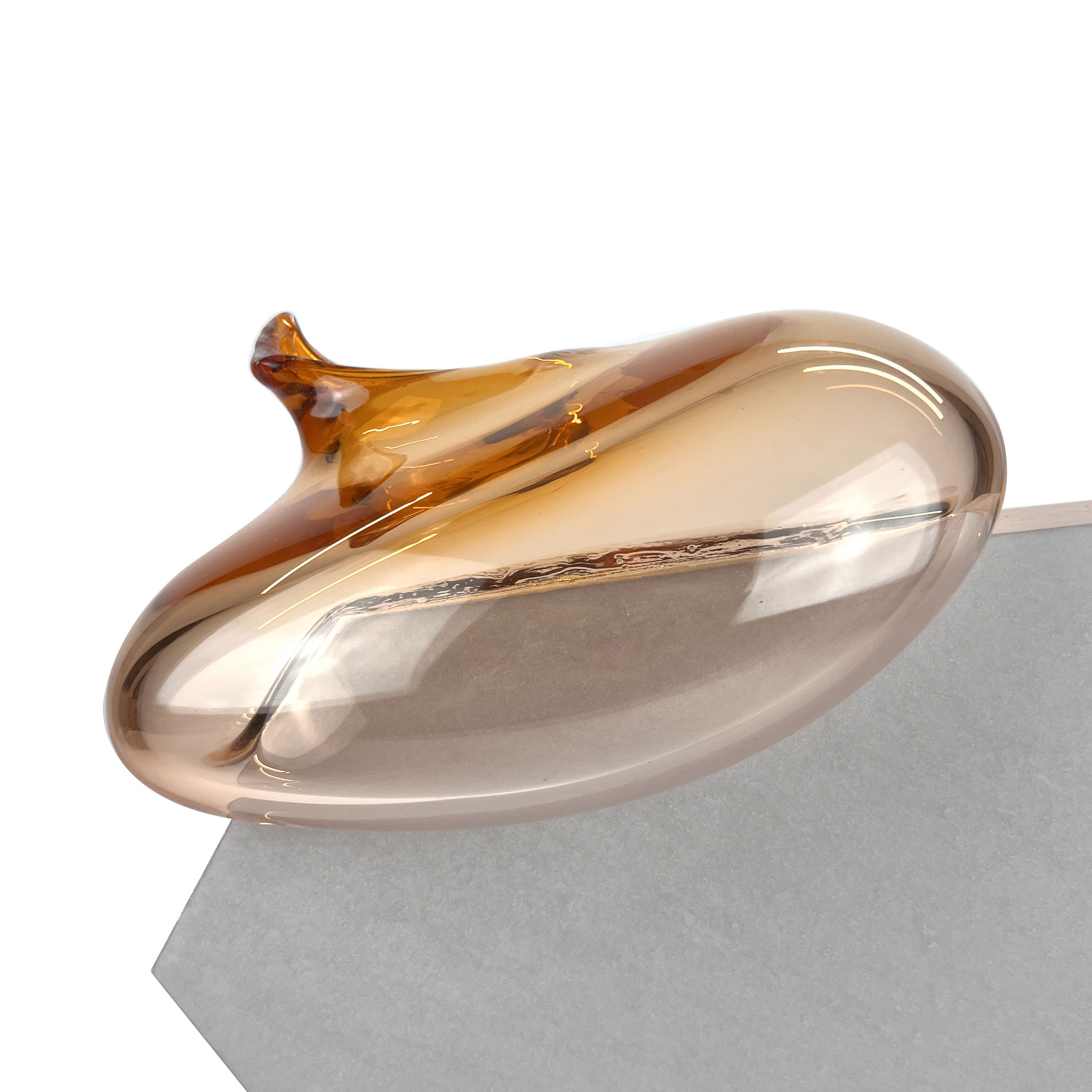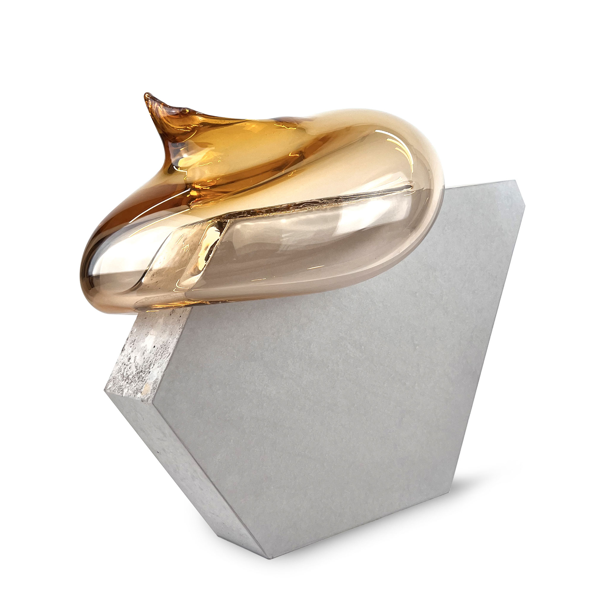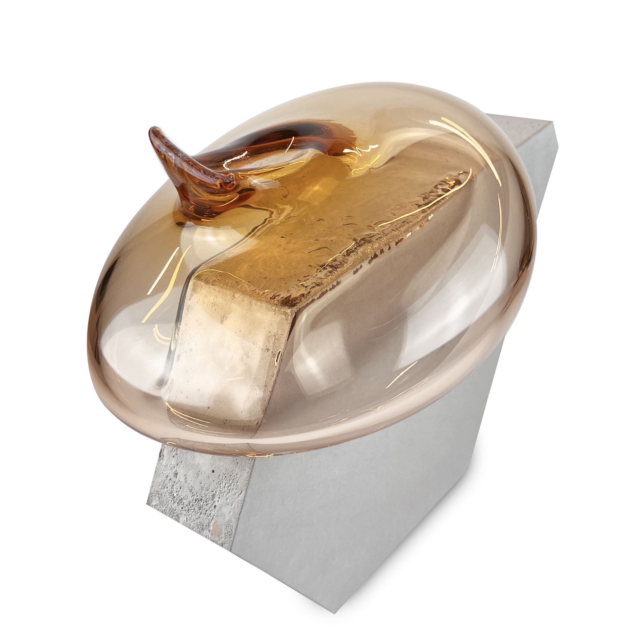 Inspiriert durch ihre raumgreifenden Installationen Bubbles (2012) und Dust Devil (2015) entstand die Serie Bubble. Eine zweiteilige Skulptur aus Beton und mundgeblasenen Glas. Im Juni 2025 waren Morgane Tschiember und wir einige Tage in Biot, der traditionsreichen Glasbläserstadt in Südfrankreich, wo eine Serie von 15 skulpturalen Arbeiten entstand. Die jeweils mundgeblasene Glasform, in unterschiedlichen Farben,  mit einer Betonform verbindet. Jede Glaskomponente ist ein Unikat: Form, Farbe und Lichtbrechung variieren – keine Arbeit gleicht der anderen. Fragilität trifft auf Masse, Schweben auf Stabilität – eine fragile Balance, die Morganes Werk eindrucksvoll verkörpert. Die glatte, leichte, fließende Glasform ist der Kontrast zu dem rauen Beton. Das Format ist der Skulptur variiert durch die Glasform, es ist ca. 35 x 40 x 25 cm. Signiert und nummeriert von Morgane Tschiember mit einem Fingerabdruck.